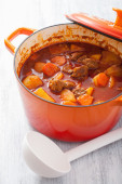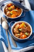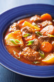 gulasz wołowy z ziemniaka i marchewki w niebieski płyta