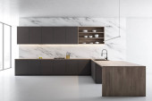 Zdjęcie "Wnętrze nowoczesnej łazienki z białymi i drewnianymi ścianami, betonową podłogą i podwójnym zlewem z długim lustrem nad nim. 3d renderowanie" może być wykorzystywane do celów osobistych i komercyjnych zgodnie z warunkami zakupionej licencji Royalty-free. Obraz jest dostępny do pobrania w jakości wysokiej rozdzielczości do 5760x3840.