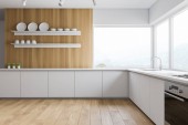 Zdjęcie "Narożnik stylowej kuchni z białymi i drewnianymi ścianami, drewnianą podłogą i wyspą z wbudowanym zlewem i kuchenką. 3d renderowanie" może być wykorzystywane do celów osobistych i komercyjnych zgodnie z warunkami zakupionej licencji Royalty-free. Obraz jest dostępny do pobrania w jakości wysokiej rozdzielczości do 5760x3840.