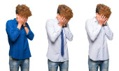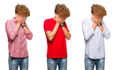 Młody, afrykański Amerykanin ubrany w luźne ubrania ze smutną miną zakrywającą twarz dłońmi podczas płaczu. koncepcja depresji.