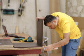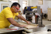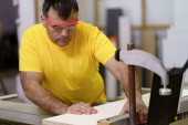 mężczyzna stolarz za pomocą piły do cięcia drewna w warsztacie
