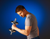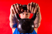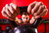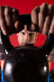 Kettlebell mężczyzna portret patrząc przez uchwyt