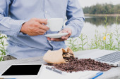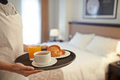 Śniadanie na tacy na łóżku w luksusowym pokoju hotelowym przed azjatycką podróżniczką biznesową korzystającą z laptopa.