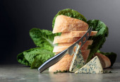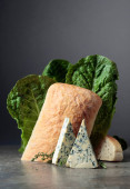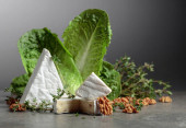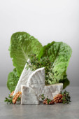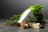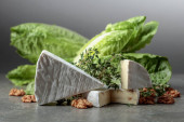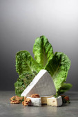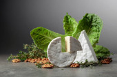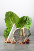 Świeży ser Brie z sałatą i orzechami włoskimi. Przestrzeń kopiowania.