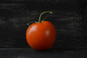 Czerwony pomidor na czarnym drewnianym tle, zbliżenie z miejscem na tekst
