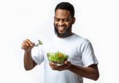 Wesoły czarny mężczyzna gospodarstwa sałatka stojąc na białym tle, Studio