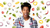 Zdjęcie "Wesoły czarny mężczyzna gospodarstwa sałatka stojąc na białym tle, Studio" może być wykorzystywane do celów osobistych i komercyjnych zgodnie z warunkami zakupionej licencji Royalty-free. Obraz jest dostępny do pobrania w jakości wysokiej rozdzielczości do 5760x3840.