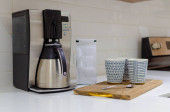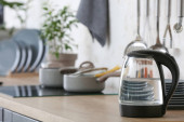 Multicooker i naczynia na stole w nowoczesnej kuchni