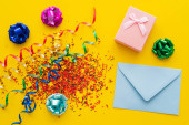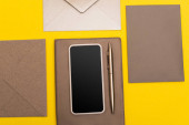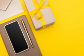 górny widok smartfona i urządzenia cyfrowego z pustym ekranem na książce z kopiarką ze złotym piórem i kopertą w pobliżu pudełka prezentów izolowane na żółto
