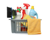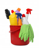 Plastikowe wiadro z różnymi środkami czyszczącymi i szmata na białym tle