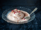 Oryginalny deser z chleba żytniego w bitej śmietanie i świeżo mrożonych jagodach w szklanej misce