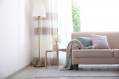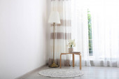 Zdjęcie "Wygodne krzesło papasańskie w pobliżu okna ze stylowymi zasłonami w salonie. Projekt wnętrza" może być wykorzystywane do celów osobistych i komercyjnych zgodnie z warunkami zakupionej licencji Royalty-free. Obraz jest dostępny do pobrania w jakości wysokiej rozdzielczości do 5760x3840.