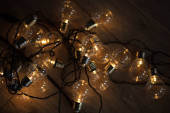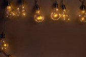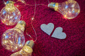 Girlanda żarówek zbliżenia leży na tekstylnym malinowym tle z bliska jasnym kolorem w ciemnych kolorach