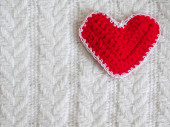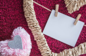 Puszysty różowy pompon ze srebrnym sercem w dłoniach z bliska na karmazynowym tle włókienniczym