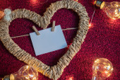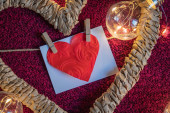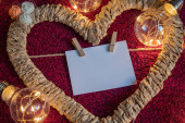 Rama w kształcie serca z kartką na szpilkach z miejscem, które ma być napisane na czerwonym tle wokół girlandy
