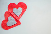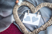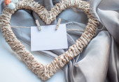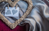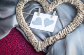 Pleciona rama w kształcie serca z kartą na szpilkach na szarym i malinowym tle włókienniczym