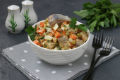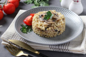 Zdjęcie "Domowe ptitim makaron z champignons w talerzu na jasnoszary stół. Format poziomy. Widok z góry" może być wykorzystywane do celów osobistych i komercyjnych zgodnie z warunkami zakupionej licencji Royalty-free. Obraz jest dostępny do pobrania w jakości wysokiej rozdzielczości do 5760x3840.