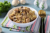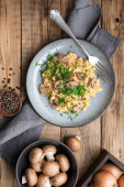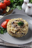 Domowe ptitim makaron z champignons w talerzu na jasnoszary stół. Format poziomy. Widok z góry