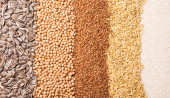 ziarna zbóż i nasion: żyta, pszenicy, jęczmienia, owsa, słonecznik, len