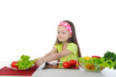 Little girl cut fresh tomatoes.
