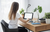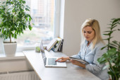 Zdjęcie "Młoda kobieta siedzi przy biurku przed szarym laptopem, marząc o miłych wspomnieniach lub przyszłości w nowoczesnym, jasnym biurze z dużym oknem" może być wykorzystywane do celów osobistych i komercyjnych zgodnie z warunkami zakupionej licencji Royalty-free. Obraz jest dostępny do pobrania w jakości wysokiej rozdzielczości do 5760x3840.