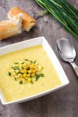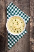Świeża zielona zupa szparagowa w misce na drewnianym stole