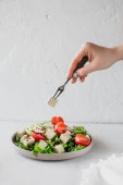 zdrowa wegańska sałatka z tofu, ziół i pomidorów na białym stole. dwubiegunowy widelec, blok sera na desce bambusowej i miska przypraw na tle. Pomysł na kolację w domu, selektywne skupienie