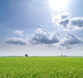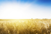 Żółte pole pszenicy oszlifowanych pod słońcem południa w błękitne niebo.