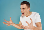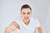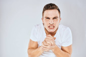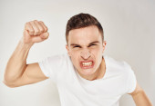 Emocjonalny mężczyzna gesty z rękami niezadowolony biały t-shirt lekkie tło