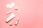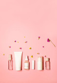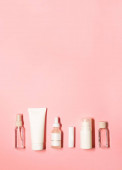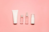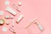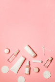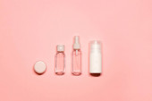 Płaskie ujęcie z miejsca na ksero na różowym tle z dodatkiem pielęgnacji skóry: krem do rąk, dezodorant, szminka, serum na twarz, olejek eteryczny z zapaloną świecą.