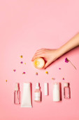 Kompozycja pionowa z naturalnymi kosmetykami do pielęgnacji skóry: maska do twarzy, serum, olejek eteryczny, balsam do ust, toner; ze świecą zapachową i płatkami kwiatów na pastelowym różowym tle.