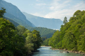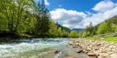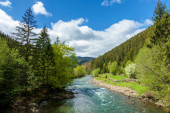 górski krajobraz rzeki w lecie. wspaniałe krajobrazy natury w mglisty poranek. Chmury toczą się nad odległym wzgórzem. drzewa wzdłuż strumienia w dolinie. słoneczna pogoda z błękitnym niebem