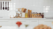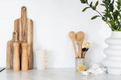 Akcesoria kuchenne, naczynia kuchenne z drewna w białej kuchni, ss