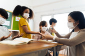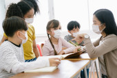Młody nauczyciel azjatycki z małym chłopcem w maskach ochronnych, uczący się w klasie podczas pandemii COVID-19. Kobieta uczy różnorodności uczniów dzieci w międzynarodowej szkole