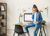 Back view of anonymous woman during work while sitting at a desk in home office