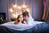 szczęśliwa rodzina w białych ubraniach w domu w pobliżu choinki.