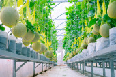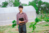 Młody rolnik posiadający tabletki i zakłady kontrolne na polu