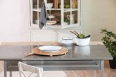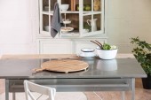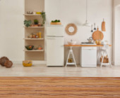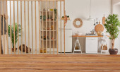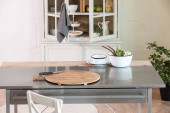 Zamknij drewniany stół i dekoracyjny styl tła kuchni. Lodówka, zmywarka i kuchenka stylu z koncepcją lampy.