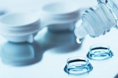 soczewki kontaktowe, etui i narzędzia na niebieskim tle z kroplami wody