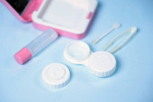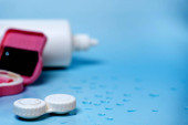 soczewki kontaktowe, etui i narzędzia na niebieskim tle z kroplami wody