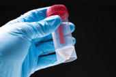 Ręka lekarza w niebieskiej rękawicy medycznej trzyma puszkę do analizy moczu, odizolowaną na czarno.