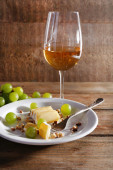 Kompozycja z butelką wódki i marynowane warzywa, świeże pieczywo na desce, na czarnym tle