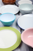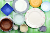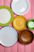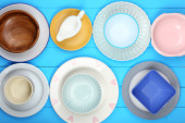 różne naczynia na drewniane tła