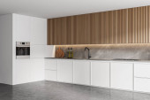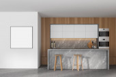 Zdjęcie "Narożnik nowoczesnej kuchni z białymi ścianami, betonową podłogą, barem ze stołkami i drewnianymi szafkami. Pionowy plakat makiety. 3d renderowanie" może być wykorzystywane do celów osobistych i komercyjnych zgodnie z warunkami zakupionej licencji Royalty-free. Obraz jest dostępny do pobrania w jakości wysokiej rozdzielczości do 5760x3840.