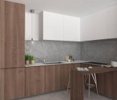 Narożnik nowoczesnej kuchni z białymi ścianami, betonową podłogą, barem ze stołkami i drewnianymi szafkami. Pionowy plakat makiety. 3d renderowanie
