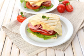Smaczne kanapki z szynką na drewnianym stole