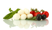 Kompozycja kulki serowe smaczne mozzarella, bazylia i czerwone pomidory, oliwy z oliwek na deski do krojenia, na białym tle