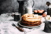 Cienkie naleśniki z masłem w talerzu. Maslenitsa wakacje