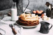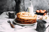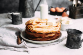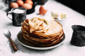 Cienkie naleśniki z masłem w talerzu. Maslenitsa wakacje