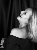 Czarno-biały portret czułej i zmysłowej blondynki w studio, stojącej z półtorarocznym ciałem w czarnej koszuli z gołymi ramionami. Jej wzrok skierowany jest do góry nogami, ręka blisko klatki piersiowej trzyma koszulę.